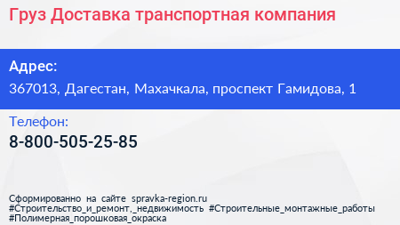 Груз-Доставка, транспортная компания по адресу 367013, Дагестан, Махачкала, проспект Гамидова, 1 в дальнейшем Организация, размещена в следующих категориях: