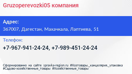 Gruzoperevozki05, компания по адресу 367007, Дагестан, Махачкала, Лаптиева, 51 в дальнейшем Организация, размещена в следующих категориях: