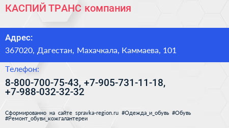 КАСПИЙ ТРАНС, компания по адресу 367020, Дагестан, Махачкала, Каммаева, 101 в дальнейшем Организация, размещена в следующих категориях: