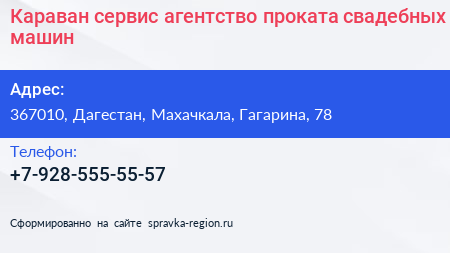 Караван сервис, агентство проката свадебных машин по адресу 367010, Дагестан, Махачкала, Гагарина, 78 в дальнейшем Организация, размещена в следующих категориях: