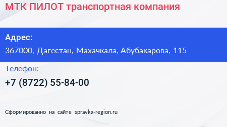 МТК ПИЛОТ, транспортная компания по адресу 367000, Дагестан, Махачкала, Абубакарова, 115 в дальнейшем Организация, размещена в следующих категориях: