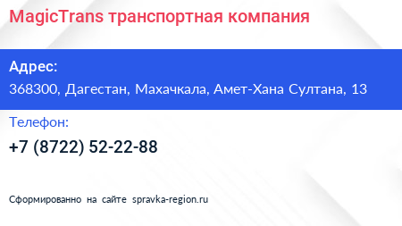 MagicTrans, транспортная компания по адресу 368300, Дагестан, Махачкала, Амет-Хана Султана, 13 в дальнейшем Организация, размещена в следующих категориях:
