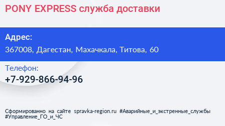 PONY EXPRESS, служба доставки по адресу 367008, Дагестан, Махачкала, Титова, 60 в дальнейшем Организация, размещена в следующих категориях: