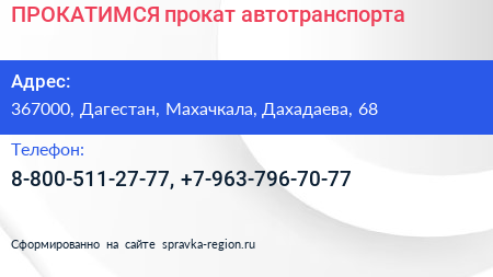 ПРОКАТИМСЯ, прокат автотранспорта по адресу 367000, Дагестан, Махачкала, Дахадаева, 68 в дальнейшем Организация, размещена в следующих категориях: