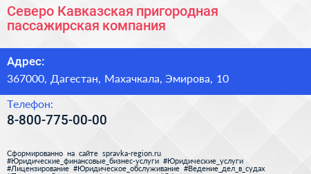 Северо-Кавказская пригородная пассажирская компания по адресу 367000, Дагестан, Махачкала, Эмирова, 10 в дальнейшем Организация, размещена в следующих категориях: