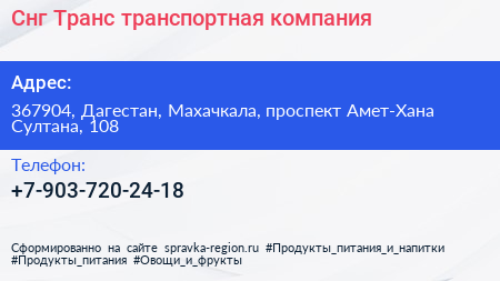 Снг Транс, транспортная компания по адресу 367904, Дагестан, Махачкала, проспект Амет-Хана Султана, 108 в дальнейшем Организация, размещена в следующих категориях: