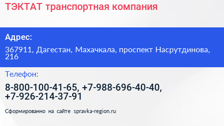 ТЭКТАТ, транспортная компания по адресу 367911, Дагестан, Махачкала, проспект Насрутдинова, 216 в дальнейшем Организация, размещена в следующих категориях: