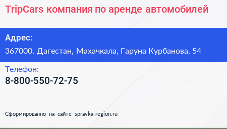 TripCars, компания по аренде автомобилей по адресу 367000, Дагестан, Махачкала, Гаруна Курбанова, 54 в дальнейшем Организация, размещена в следующих категориях:
