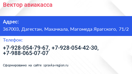 Вектор, авиакасса по адресу 367003, Дагестан, Махачкала, Магомеда Ярагского, 71/2 в дальнейшем Организация, размещена в следующих категориях: