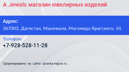 A Jewels, магазин ювелирных изделий по адресу 367003, Дагестан, Махачкала, Магомеда Ярагского, 61 в дальнейшем Организация, размещена в следующих категориях: