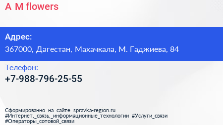 A & М flowers по адресу 367000, Дагестан, Махачкала, М. Гаджиева, 84 в дальнейшем Организация, размещена в следующих категориях: