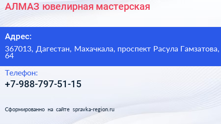 АЛМАЗ, ювелирная мастерская по адресу 367013, Дагестан, Махачкала, проспект Расула Гамзатова, 64 в дальнейшем Организация, размещена в следующих категориях: