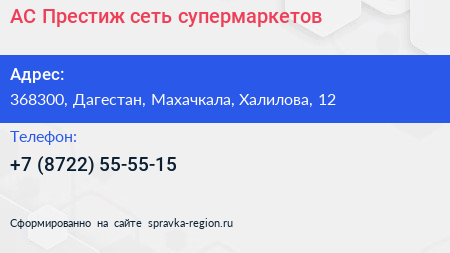 АС Престиж, сеть супермаркетов по адресу 368300, Дагестан, Махачкала, Халилова, 12 в дальнейшем Организация, размещена в следующих категориях: