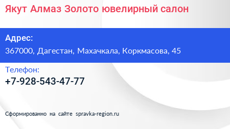 Якут-Алмаз-Золото, ювелирный салон по адресу 367000, Дагестан, Махачкала, Коркмасова, 45 в дальнейшем Организация, размещена в следующих категориях: