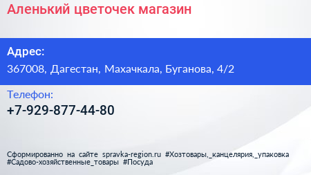 Аленький цветочек, магазин по адресу 367008, Дагестан, Махачкала, Буганова, 4/2 в дальнейшем Организация, размещена в следующих категориях: