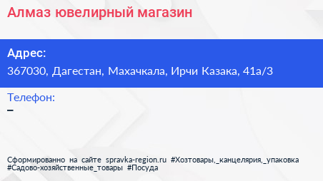Алмаз, ювелирный магазин по адресу 367030, Дагестан, Махачкала, Ирчи Казака, 41а/3 в дальнейшем Организация, размещена в следующих категориях: