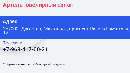 Артель, ювелирный салон по адресу 367000, Дагестан, Махачкала, проспект Расула Гамзатова, 17 в дальнейшем Организация, размещена в следующих категориях: