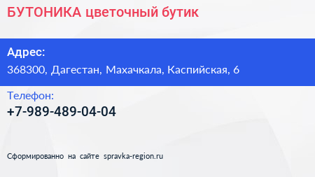 БУТОНИКА, цветочный бутик по адресу 368300, Дагестан, Махачкала, Каспийская, 6 в дальнейшем Организация, размещена в следующих категориях: