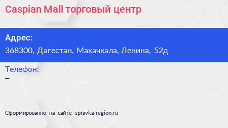 Caspian Mall, торговый центр по адресу 368300, Дагестан, Махачкала, Ленина, 52д в дальнейшем Организация, размещена в следующих категориях: