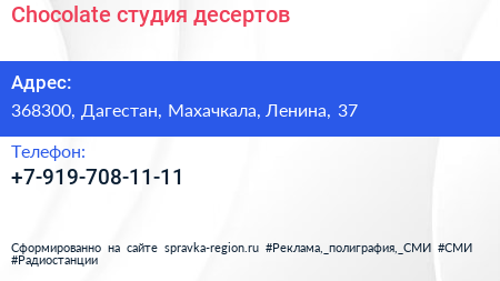 Chocolate, студия десертов по адресу 368300, Дагестан, Махачкала, Ленина, 37 в дальнейшем Организация, размещена в следующих категориях: