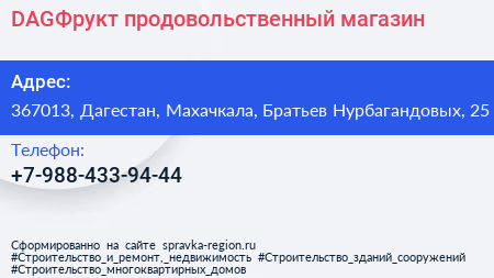 DAGФрукт, продовольственный магазин по адресу 367013, Дагестан, Махачкала, Братьев Нурбагандовых, 25 в дальнейшем Организация, размещена в следующих категориях: