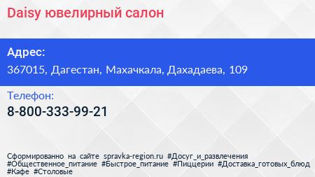 Daisy, ювелирный салон по адресу 367015, Дагестан, Махачкала, Дахадаева, 109 в дальнейшем Организация, размещена в следующих категориях: