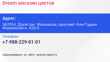Dream, магазин цветов по адресу 367014, Дагестан, Махачкала, проспект Али-Гаджи Акушинского, 42а/2 в дальнейшем Организация, размещена в следующих категориях: