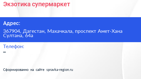 Экзотика, супермаркет по адресу 367904, Дагестан, Махачкала, проспект Амет-Хана Султана, 64а в дальнейшем Организация, размещена в следующих категориях: