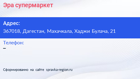 Эра, супермаркет по адресу 367018, Дагестан, Махачкала, Хаджи Булача, 21 в дальнейшем Организация, размещена в следующих категориях: