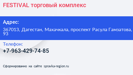 FESTIVAL, торговый комплекс по адресу 367013, Дагестан, Махачкала, проспект Расула Гамзатова, 93 в дальнейшем Организация, размещена в следующих категориях: