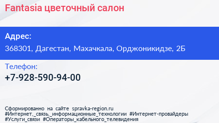 Fantasia, цветочный салон по адресу 368301, Дагестан, Махачкала, Орджоникидзе, 2Б в дальнейшем Организация, размещена в следующих категориях:
