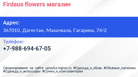 Firdaus flowers, магазин по адресу 367010, Дагестан, Махачкала, Гагарина, 74/2 в дальнейшем Организация, размещена в следующих категориях: