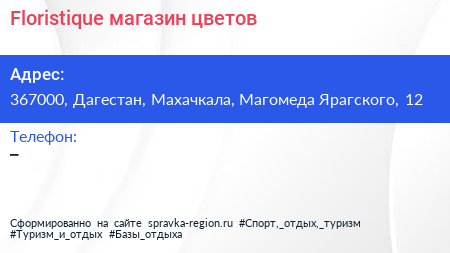 Floristique, магазин цветов по адресу 367000, Дагестан, Махачкала, Магомеда Ярагского, 12 в дальнейшем Организация, размещена в следующих категориях: