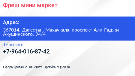 Фреш, мини-маркет по адресу 367014, Дагестан, Махачкала, проспект Али-Гаджи Акушинского, 94/4 в дальнейшем Организация, размещена в следующих категориях: