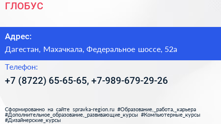 ГЛОБУС по адресу Дагестан, Махачкала, Федеральное шоссе, 52а в дальнейшем Организация, размещена в следующих категориях: