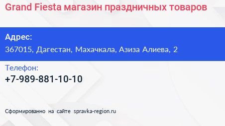 Grand Fiesta, магазин праздничных товаров по адресу 367015, Дагестан, Махачкала, Азиза Алиева, 2 в дальнейшем Организация, размещена в следующих категориях: