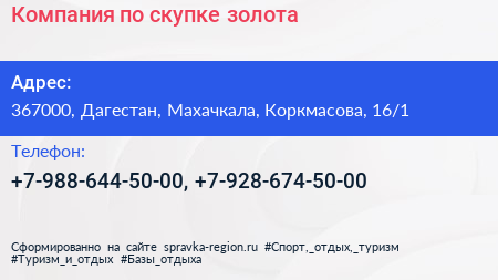 Компания по скупке золота по адресу 367000, Дагестан, Махачкала, Коркмасова, 16/1 в дальнейшем Организация, размещена в следующих категориях: