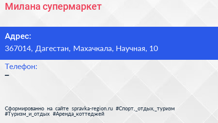 Милана, супермаркет по адресу 367014, Дагестан, Махачкала, Научная, 10 в дальнейшем Организация, размещена в следующих категориях: