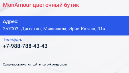 MonAmour, цветочный бутик по адресу 367003, Дагестан, Махачкала, Ирчи Казака, 31а в дальнейшем Организация, размещена в следующих категориях: