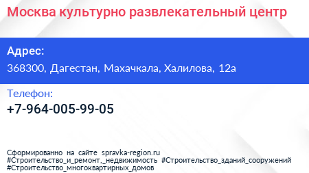 Москва, культурно-развлекательный центр по адресу 368300, Дагестан, Махачкала, Халилова, 12а в дальнейшем Организация, размещена в следующих категориях: