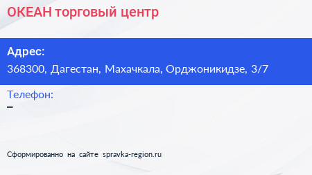 ОКЕАН, торговый центр по адресу 368300, Дагестан, Махачкала, Орджоникидзе, 3/7 в дальнейшем Организация, размещена в следующих категориях: