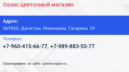 Оазис, цветочный магазин по адресу 367010, Дагестан, Махачкала, Гагарина, 19 в дальнейшем Организация, размещена в следующих категориях: