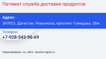 Патимат, служба доставки продуктов по адресу 367013, Дагестан, Махачкала, проспект Гамидова, 18ж в дальнейшем Организация, размещена в следующих категориях: