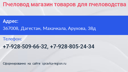 Пчеловод, магазин товаров для пчеловодства по адресу 367008, Дагестан, Махачкала, Арухова, 38д в дальнейшем Организация, размещена в следующих категориях: