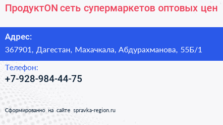 ПродуктON, сеть супермаркетов оптовых цен по адресу 367901, Дагестан, Махачкала, Абдурахманова, 55Б/1 в дальнейшем Организация, размещена в следующих категориях: