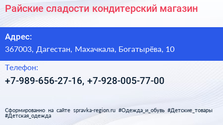 Райские сладости, кондитерский магазин по адресу 367003, Дагестан, Махачкала, Богатырёва, 10 в дальнейшем Организация, размещена в следующих категориях: