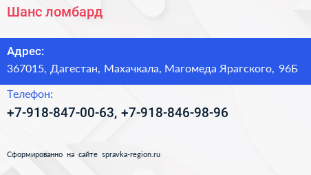 Шанс, ломбард по адресу 367015, Дагестан, Махачкала, Магомеда Ярагского, 96Б в дальнейшем Организация, размещена в следующих категориях:
