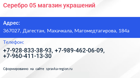 Серебро 05, магазин украшений по адресу 367027, Дагестан, Махачкала, Магомедтагирова, 184а в дальнейшем Организация, размещена в следующих категориях: