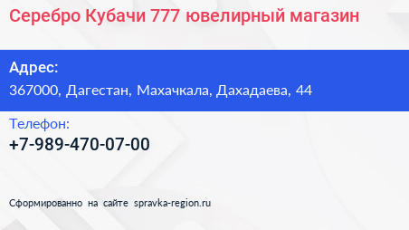 Серебро Кубачи 777, ювелирный магазин по адресу 367000, Дагестан, Махачкала, Дахадаева, 44 в дальнейшем Организация, размещена в следующих категориях: