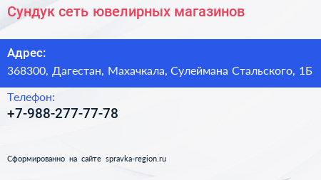 Сундук, сеть ювелирных магазинов по адресу 368300, Дагестан, Махачкала, Сулеймана Стальского, 1Б в дальнейшем Организация, размещена в следующих категориях: